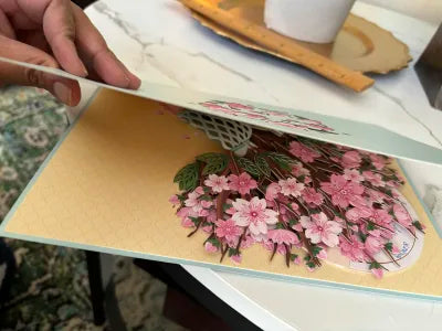 Le bouquet de fleurs pop-up 3D, finement découpé au laser, se révèle dès l’ouverture de la carte pour un effet spectaculaire.